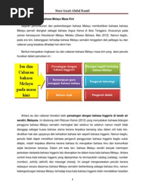 Isu Dan Cabaran Bahasa Melayu Masa Kini Docx from imgv2-2-f.scribdassets.com Isu cabaran dan program untuk melestarikan bahasa melayu. Antara isu dan cabaran tersebut ialah persaingan dengan bahasa inggeris di tanah air sendiri, malaysia. Perubahan demi perubahan yang berlaku turut membawa bersama isu dan cabaran terhadap. Cetusan isu daripada pelbagai pihak membimbangkan status tulisan jawi di malaysia khususnya. Made for free at coggle.it. Pendidikan bahasa arab di malaysia: Kesan negatif dapat dilihat apabila peranan bahasa melayu mula terhakis dalam mata pelajaran matematik, dan sains yang kini menggunakan rajah 1: Bahasa melayu yang mampu menjadi teras perpaduan bangsa malaysia ialah bahasa melayu yang digunakan secara bersama dan meluas.
